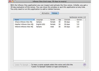 Il pacchetto Infovox iVox italiano espande le potenzialità vocali del tuo Mac grazie alle voci di Vittorio, Chiara e Heather. La qualità del prodotto è molto alta, e le opzioni presenti ti permettono un livello di personalizzazione elevato.